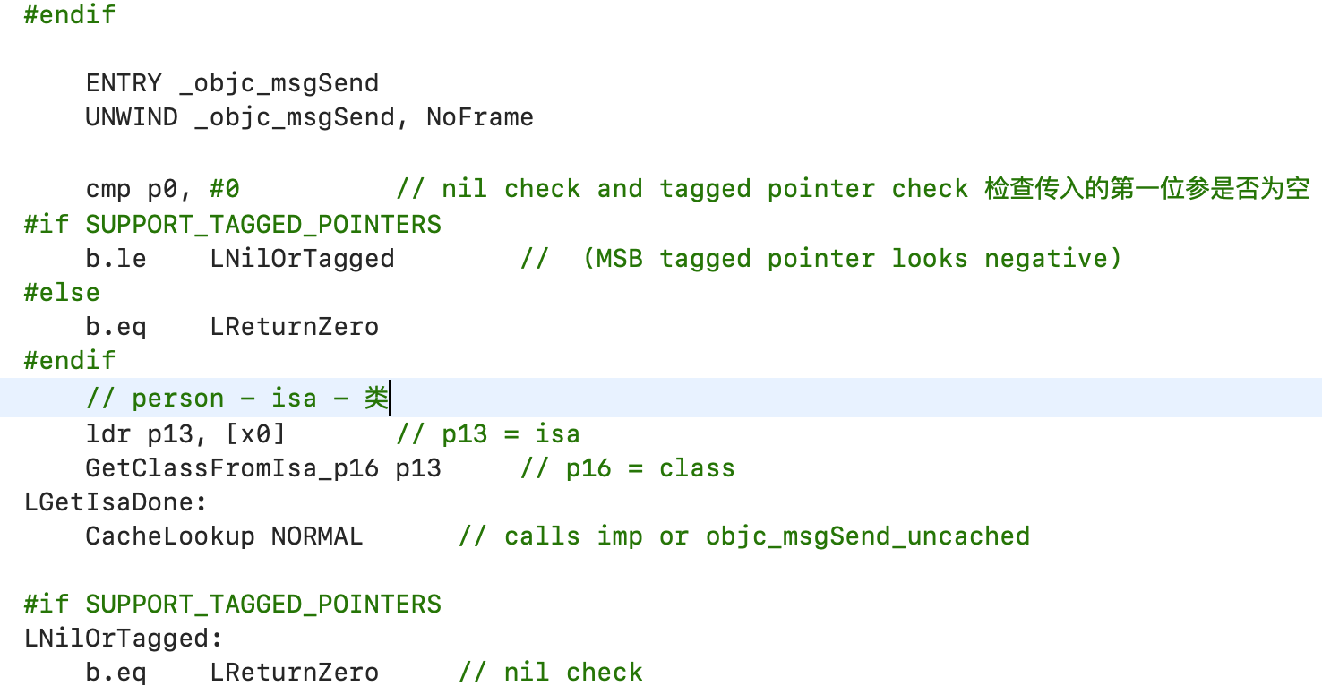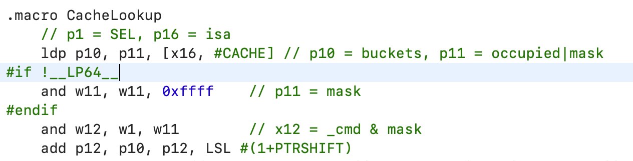 .macro CheckMiss // miss if bucket->sel == 0.if $0 == GETIMP cbz p9, LGetImpMiss.elseif $0 == NORMAL cbz p9, __objc_msgSend_uncached.elseif $0 == LOOKUP cbz p9, __objc_msgLookup_uncached