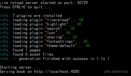 执行命令gitbook serve后如下图所示: