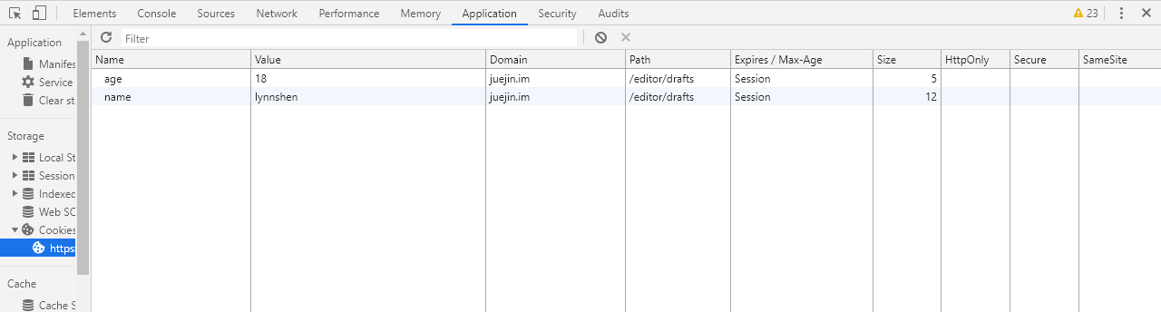document.cookie="name=lynnshen; age=18"
