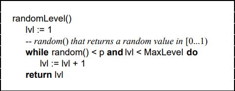 template <typename Key, typename Value>int SkipList<Key, Value>::randomLevel() { static const unsigned int kBranching = 4; int height = 1; while (height < kMaxLevel && ((::Next(rnd_) % kBranching) == 0)) { height++; } assert(height > 0); assert(height <= kMaxLevel); return height;}uint32_t Next( uint32_t& seed) { seed = seed & 0x7fffffffu; if (seed == 0 || seed == 2147483647L) { seed = 1; } static const uint32_t M = 2147483647L; static const uint64_t A = 16807; uint64_t product = seed * A; seed = static_cast<uint32_t>((product >> 31) + (product & M)); if (seed > M) { seed -= M; } return seed;}