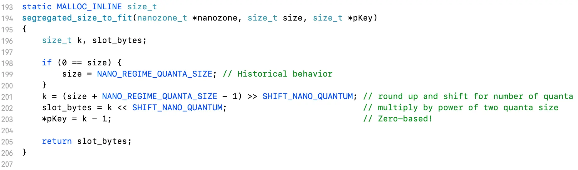 在 libmalloc/src/nano_malloc.c 第193行,我们发现如下的代码:
