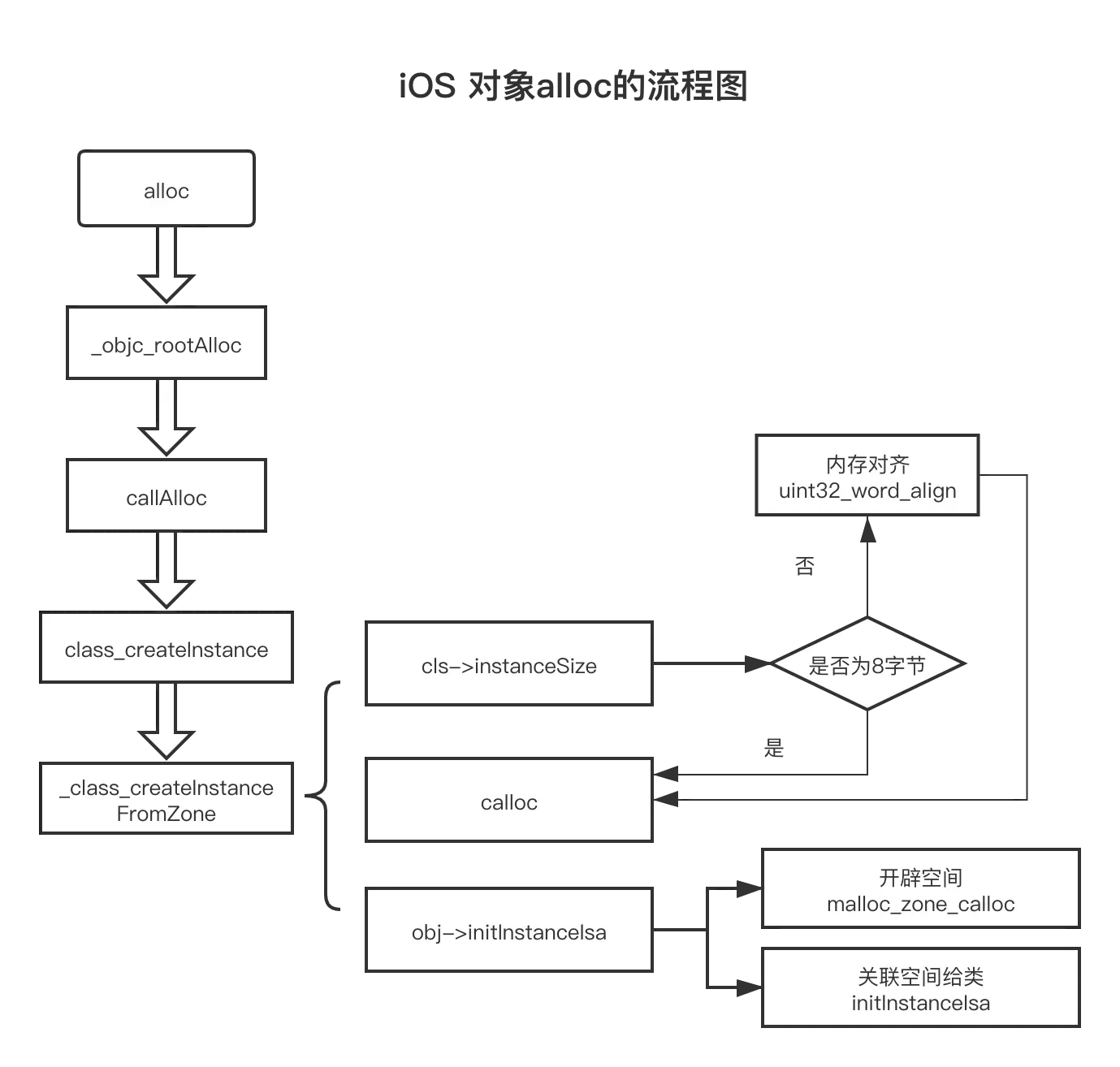 总的来说,alloc的过程,即时在堆区开辟空间给对象,并在栈区开辟指针(大小为8字节)指向该对象的内存区,即给定isa,以方便寻址。