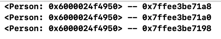 在这里,我们**[Person alloc]创建了一个p 对象的内存空间,而[p1 init]**则是创建同样是指向p1的指针p2,p3,因为和p1 内存空间一致,所以地址均为0x6000024f4950,但是指向该3个指针的指针不一样,所以&p1, &p2, &p3 地址不一致。