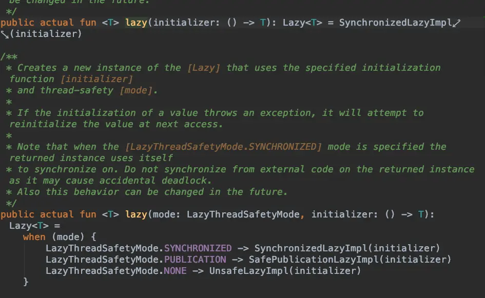 private class SynchronizedLazyImpl<out T>(initializer: () -> T, lock: Any? = null) : Lazy<T>, Serializable {