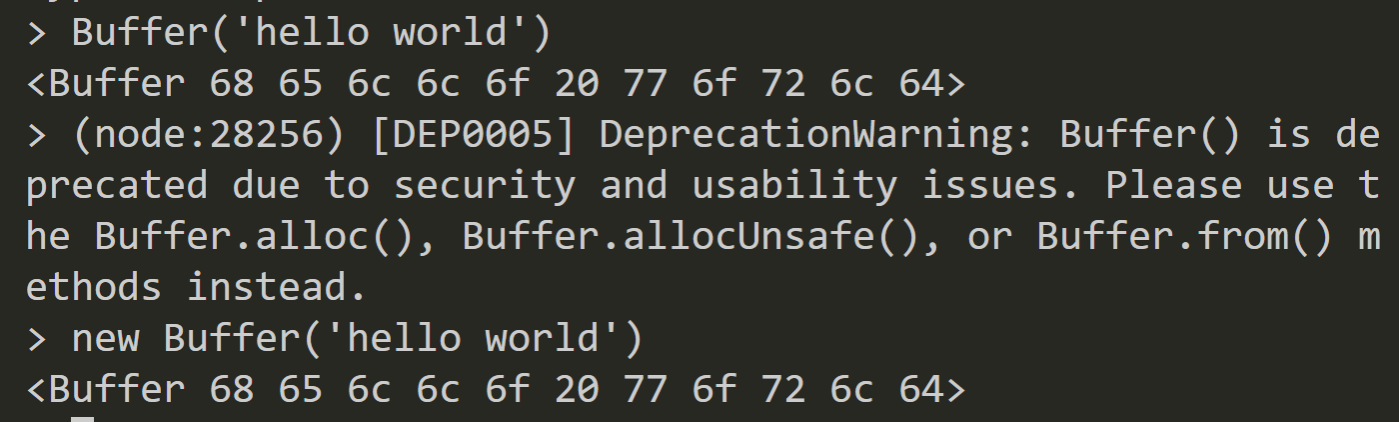 值得注意的是,在node中,new Buffer('xxx')和Buffer('xxx')因为存在着安全性问题,在v6的时候就被废弃了。所以我们需要使用Buffer.from或者Buffer.alloc 来替代。这里建议启用ESLint规则no-buffer-constructor或node/no-deprecated-api以避免意外的不安全Buffer API使用。