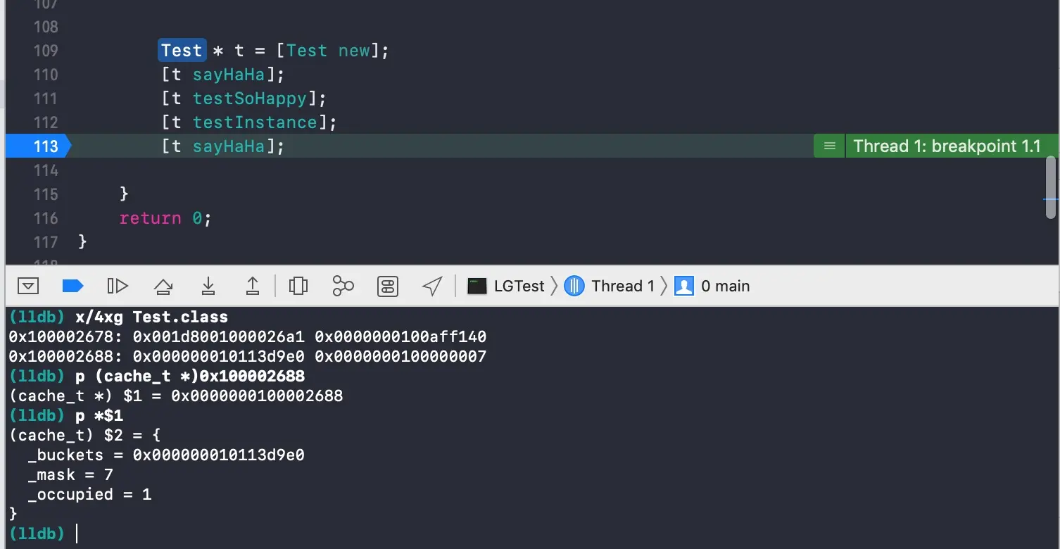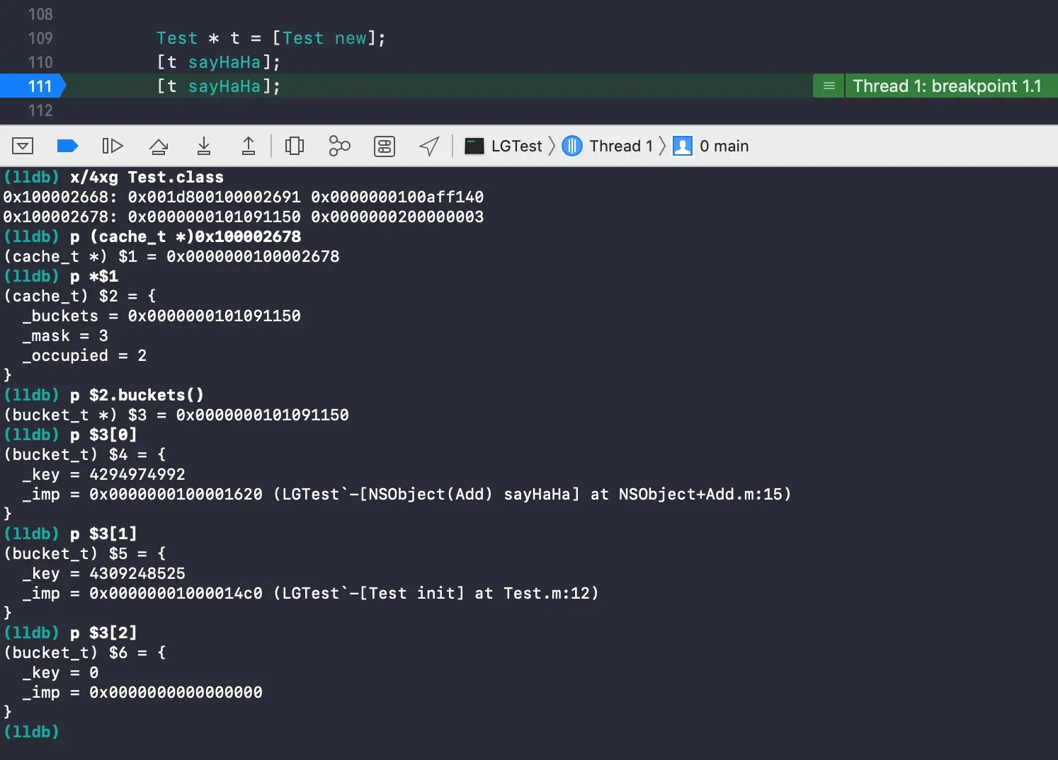 通过LLDB调试,打印出Test类中cache_t内的信息,可以从图中看出,在Test初始化对象,调用sayHaHa方法后被缓存,哈希表的长度为3,方法缓存的个数为2,分别是sayHaHa、init方法。