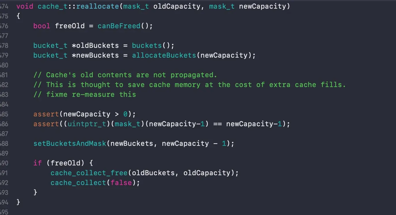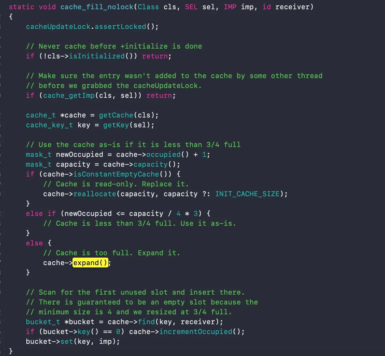 struct cache_t { struct bucket_t *_buckets; //哈希表 mask_t _mask; //散列表的长度 -1 mask_t _occupied; //当前缓存的方法个数 public: struct bucket_t *buckets(); mask_t mask(); mask_t occupied(); void incrementOccupied(); void setBucketsAndMask(struct bucket_t *newBuckets, mask_t newMask); void initializeToEmpty(); mask_t capacity(); bool isConstantEmptyCache(); bool canBeFreed(); static size_t bytesForCapacity(uint32_t cap); static struct bucket_t * endMarker(struct bucket_t *b, uint32_t cap); void expand(); void reallocate(mask_t oldCapacity, mask_t newCapacity); struct bucket_t * find(cache_key_t key, id receiver); static void bad_cache(id receiver, SEL sel, Class isa) __attribute__((noreturn)); };