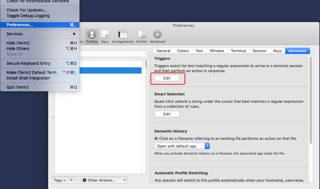 配置iTerm2 1、打开 iTerm2 => Preferences => Profiles => Advanced => Triggers Edit