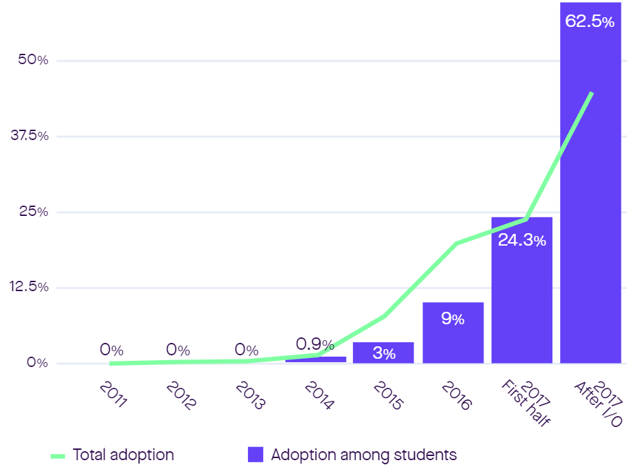 早在2018年,Pusher就发起了一项开发者调查,数据显示,归功于Android,Kotlin的使用率正在爆发式增长,大部分开发者在他们的工作中或副业的项目中使用Kotlin编程,Pusher还补充道:说到Kotlin最受青睐的特性,大多数开发者表示Kotlin是安全的,80%的开发者喜欢null安全,其次是扩展函数,Java的简化互操作性和数据类。