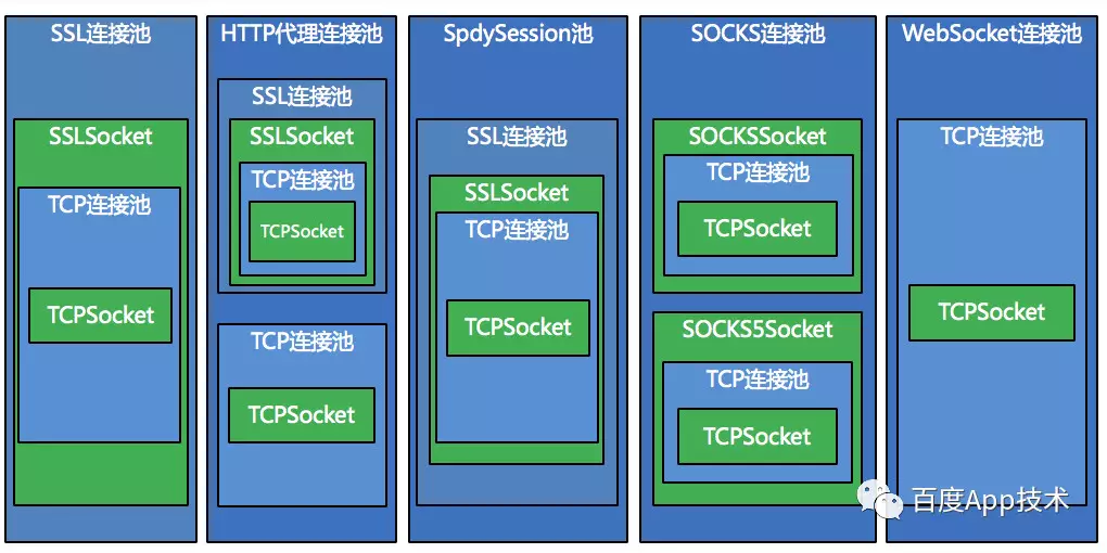 有高级连接池,包括HTTP代理连接池(管理HTTP代理请求的连接),SpdySession连接池(管理SPDY和HTTP/2请求的连接),SOCKS连接池(管理SOCKS和SOCKS5代理的连接),SSL连接池(管理HTTPS请求的连接)。
