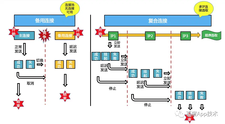 TCP连接优化是一个比较复杂的内容,百度App做了针对性场景优化,包括预连接,连接重建,备用连接,复合连接。