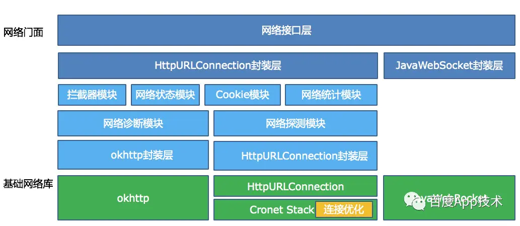 百度App的Android网络流量目前都在okhttp之上,上层进行了网络门面的封装,封装内部的实现细节和对外友好的API,目前我们正在进行重构,默认采用Android标准的网络接口HttpURLConnection,它的底层由系统提供的okhttp的实现。