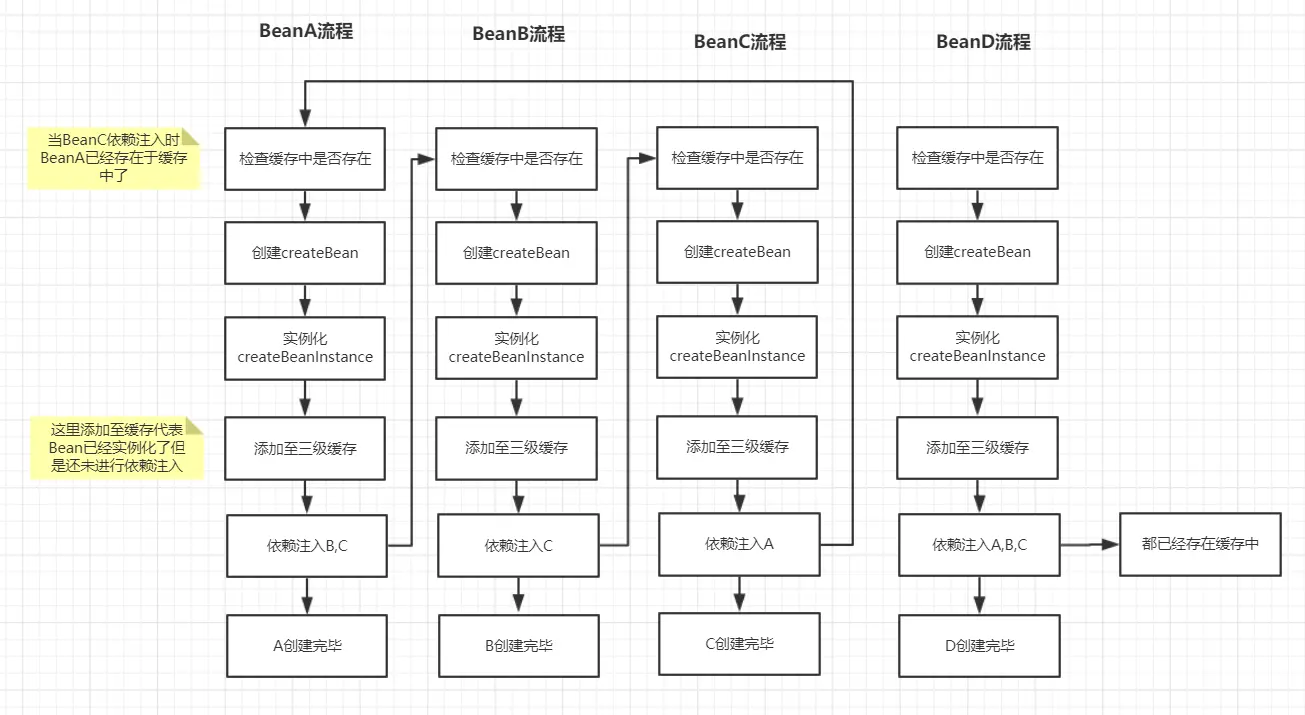 假设例子中存在BeanA、BeanB、BeanC、BeanD四个Bean,其中