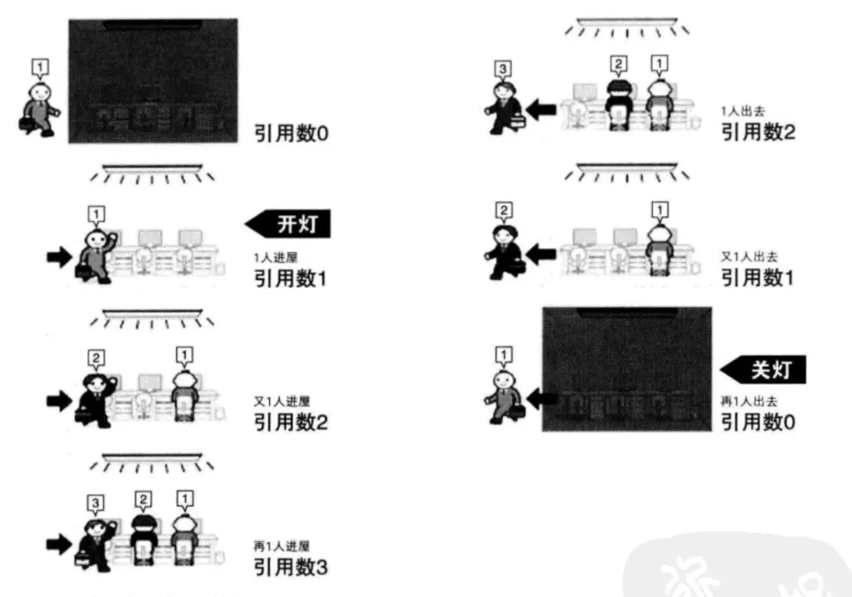 解释: 1.有人来上班打卡了:开灯。——(创建对象,计数为1) 2.又有人来了:保持开灯。——(保持对象,计数为2) 3.又有人来了:保持开灯。——(保持对象,计数为3) 4.有人下班打卡了:保持开灯。——(保持对象,计数为2) 5.又有人下班了:保持开灯。——(保持对象,计数为1) 6.所有员工全下班了:关灯。——(销毁对象,计数为0)