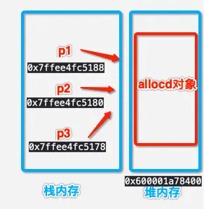 结论:P1、P2、P3三个不同的指针指向了同一块内存区域