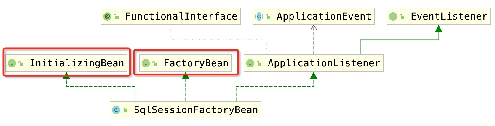 接下来看下原理,从配置流程可以看到mybatis把SqlSessionFactory交给了Spring容器进行管理,看下SqlSessionFactoryBean的继承结构,