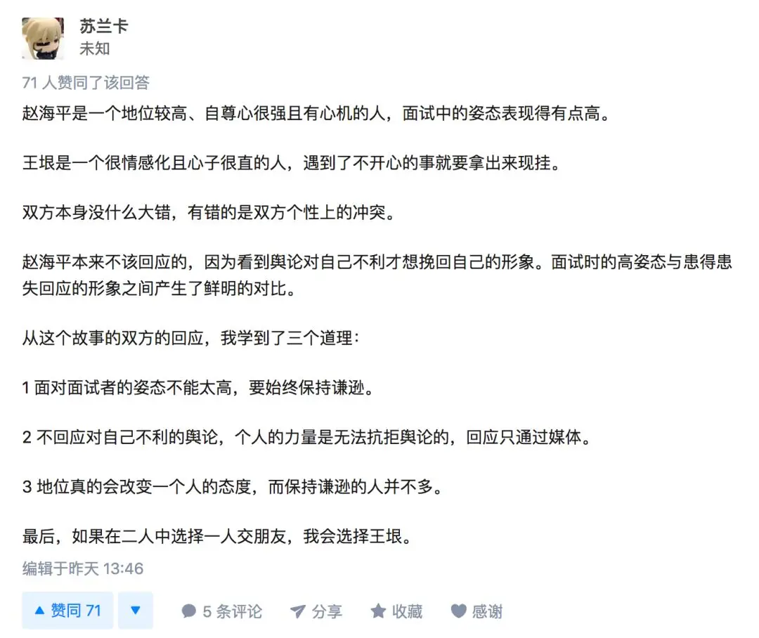 双方本没什么大错,有错的是双方个性上的冲突。赵海平本来不该回应的,因为看到舆论对自己不利才想挽回自己的形象。面试时的高姿态与患得患失回应的形象之间产生了鲜明的对比。