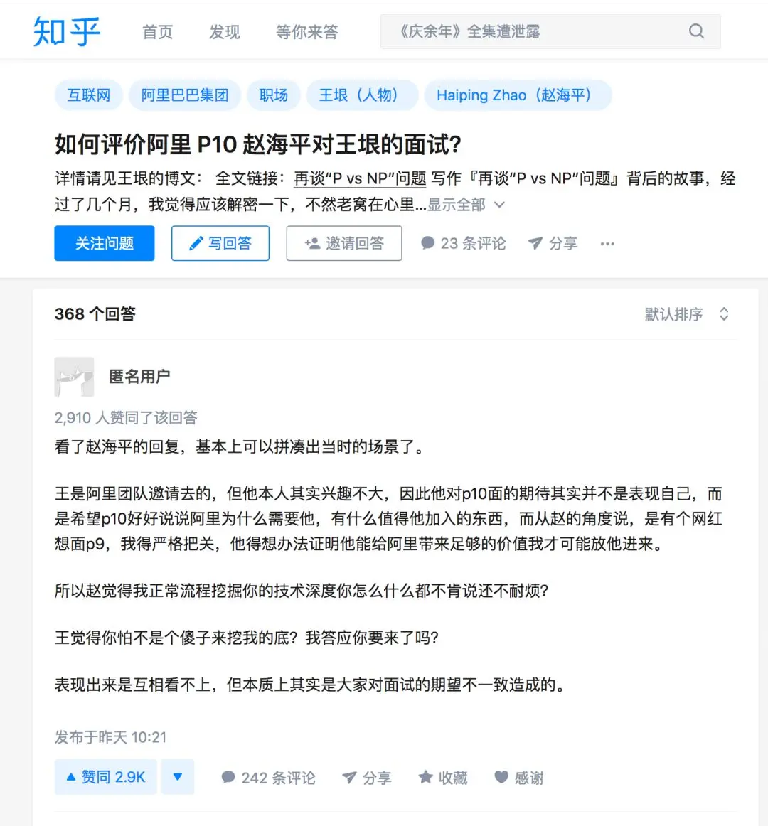 事件自12日发酵至今,终于迎来第一个热搜“如何评价阿里P10赵海平对王垠的面试?”对于坊间传闻四起,今日赵海平第一次公开回复了王垠,以下为赵海平回复王垠全文: