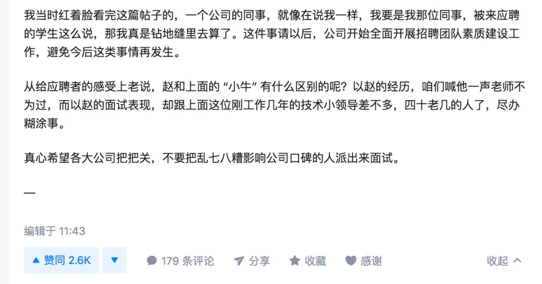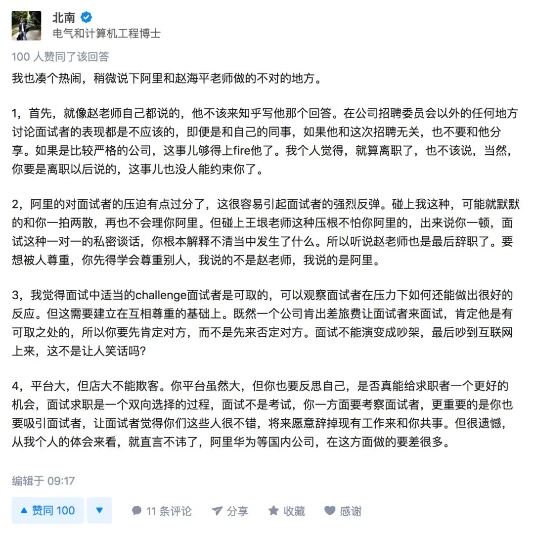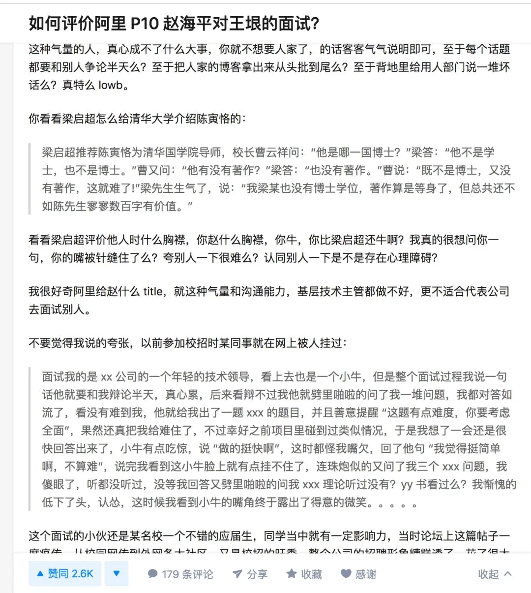 justlikemath:不合适道歉就是了,还要强辩给自己的rudeness 找各种什么面试原则,公司条例,营造出自己只是稍微不客气的形象。看得出确实面试老手。最后抛出一个弱点,说了富二代的玩笑之类的,但是这个点只是因为自己没有过多注意而已,而它却有"一年未工作,"red flag"坚实理由支撑。————这不就是面试常用手段吗?哈哈,你工作中犯过最大错是什么,你最大的缺点是什么?答起来是一样的,说的都是小问题小疏忽,但是理由都异常坚实,连续加班导致的,客观条件限制的。小男:说来说去还是在互相diss对方没有作出实质上的工作。无非就是学的多的,diss学的少的,学的深的,diss学的浅的。实在没有可diss的,就diss没做出实质的东西。或者做的多的就diss做的少的。真做出东西赚到钱了,就自己与自己和解了。送丁大凤进士赴举:这事吧先找个公关顾问review一下。感觉是给自己越抹越黑。要追究透露名字的人,你是嫌敌人不够多吗?弱弱的问一句,赵老师从阿里离职去哪里啦?