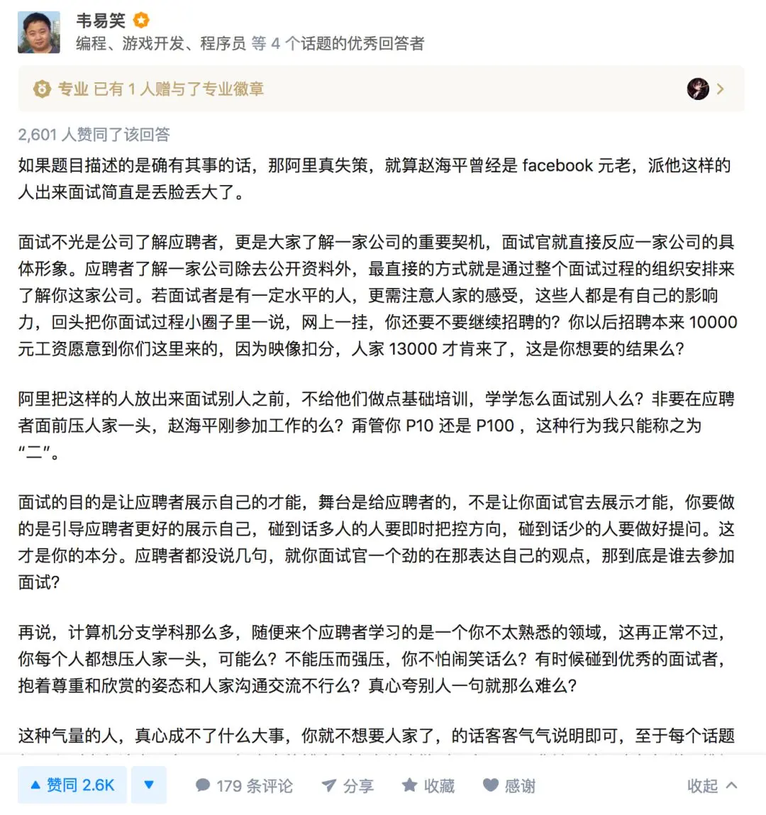 lisamay:让一个世俗的“普通科学家”去面试一个天才,这本身说明阿里巴巴的人事制度需要改革,别人只是太过实在说出了这个公司的问题,就说别人抱怨这是偏见!
