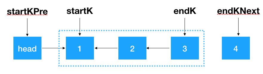 找到 startK 和 endK 之后,根据之前的迭代翻转法对 startK 和 endK 的这段链表进行翻转