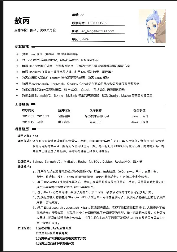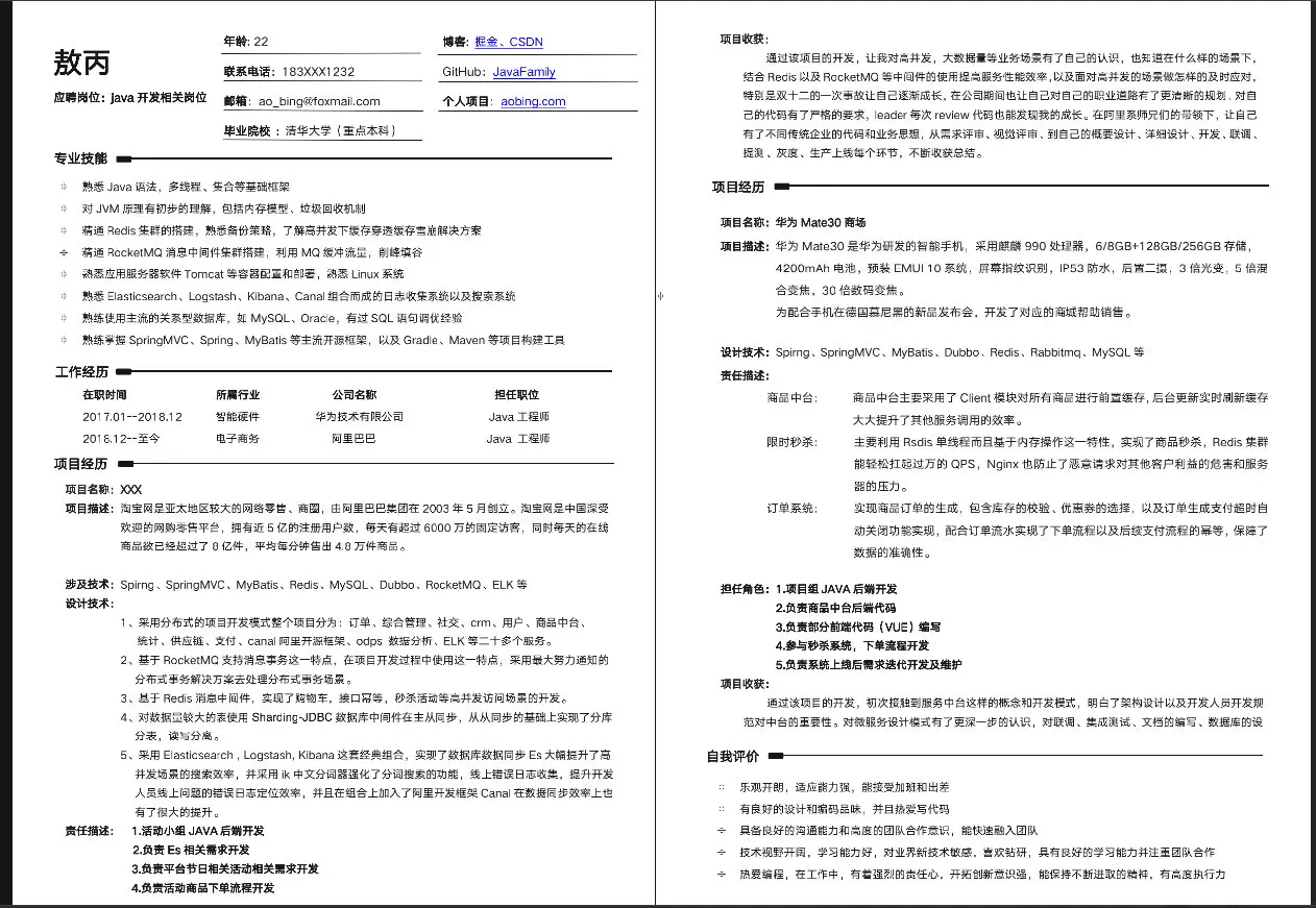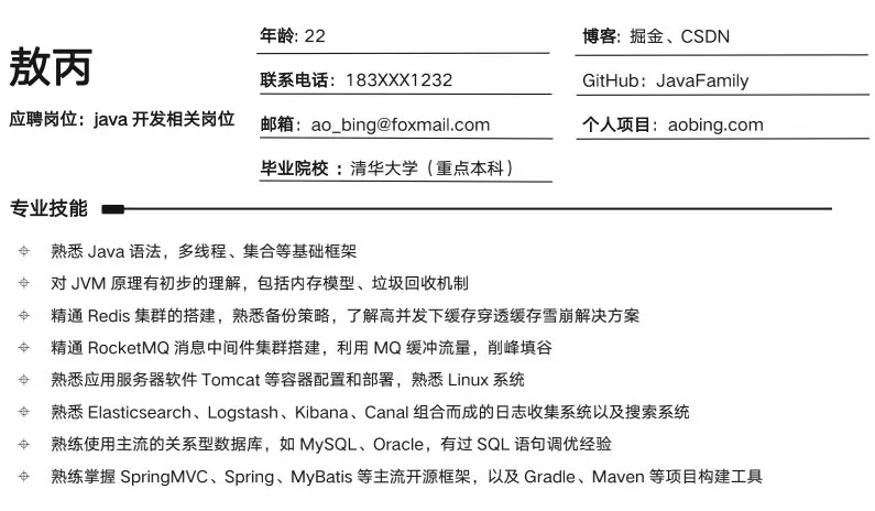 Tip:简历内容都是我改过了的,不过简历的模板和布局倒是我之前一直在用的,公众号回复【模板】获取简历模板。