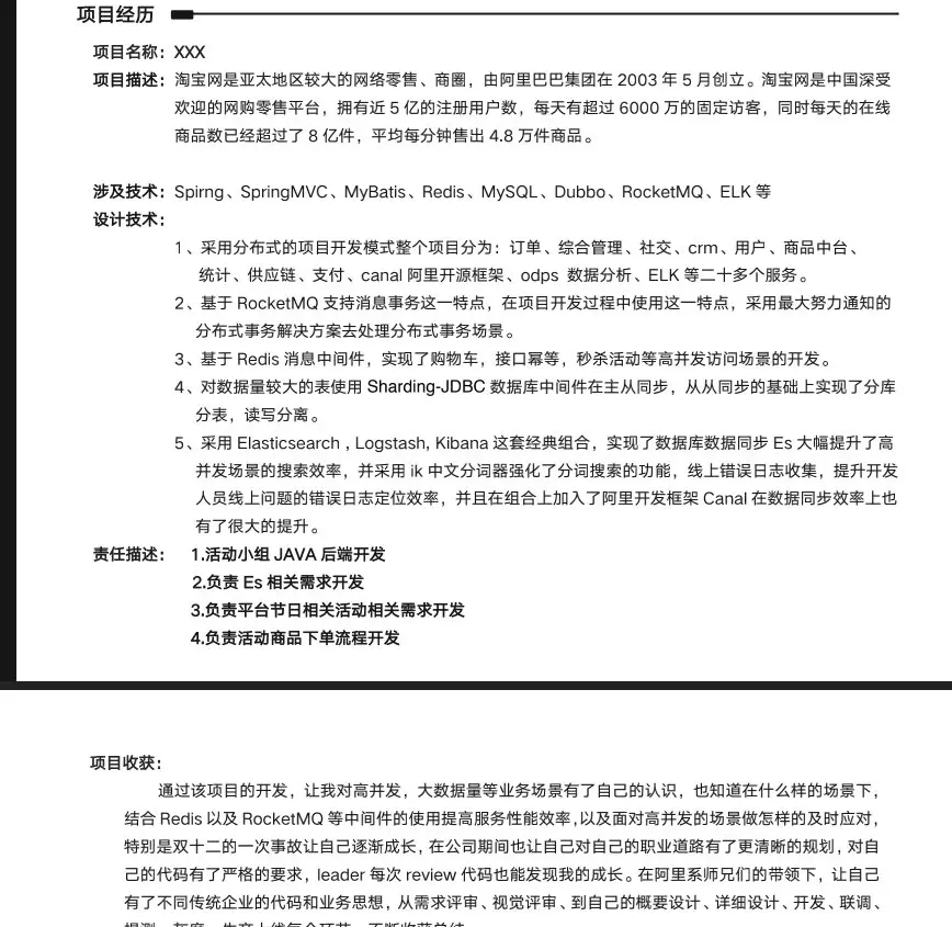 难点收获:这个没有就不写了,有的话还是可以写一下的,像我自己一些大促场景的线上BUG,还有一些难点攻坚的,我都会写一下,这样可能会给面试官进一步了解你的机会。