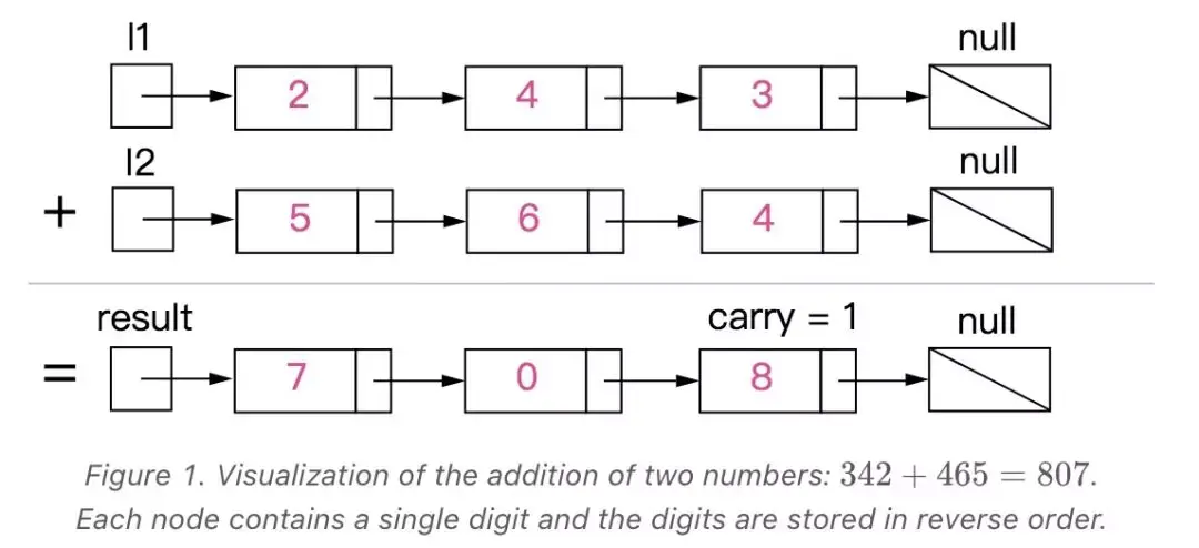 题目不难理解,思路也很容易想明白,其实就是模拟小学生打竖式计算加减的方法,来计算两个整数的加和。但是既然是加法,就可能涉及进位,比如两个两位数的和可能是一个三位数。还有一个难点是需要使用链表来实现,涉及链表,编码的复杂度会更大一些。