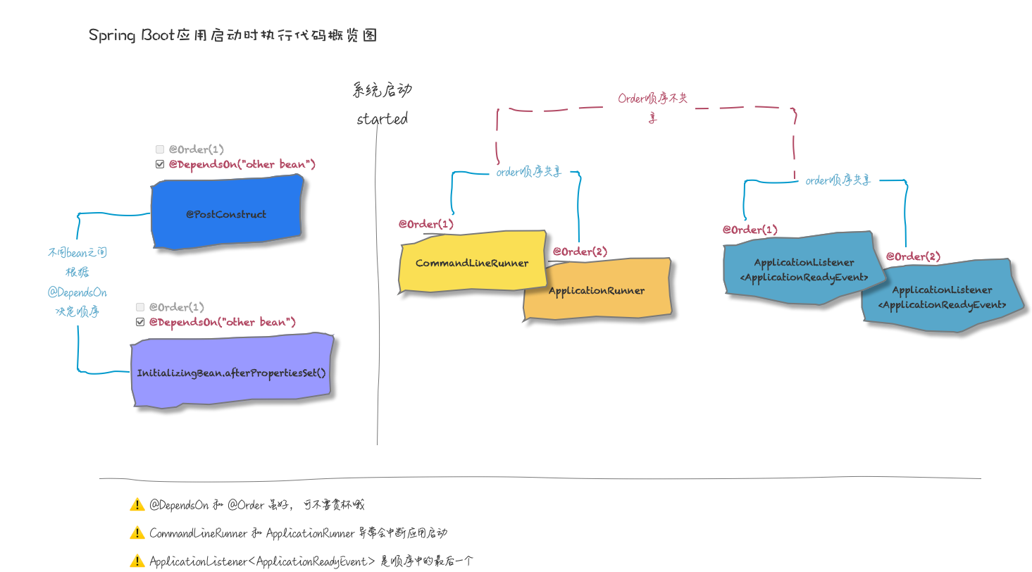 @Order太多看到 order 这个 "黑科技" 我们会觉得它可以非常方便将启动逻辑按照指定顺序执行,但如果你这么写,说明多个代码片段是有相互依赖关系的,为了让我们的代码更好维护,我们应该减少这种依赖使用