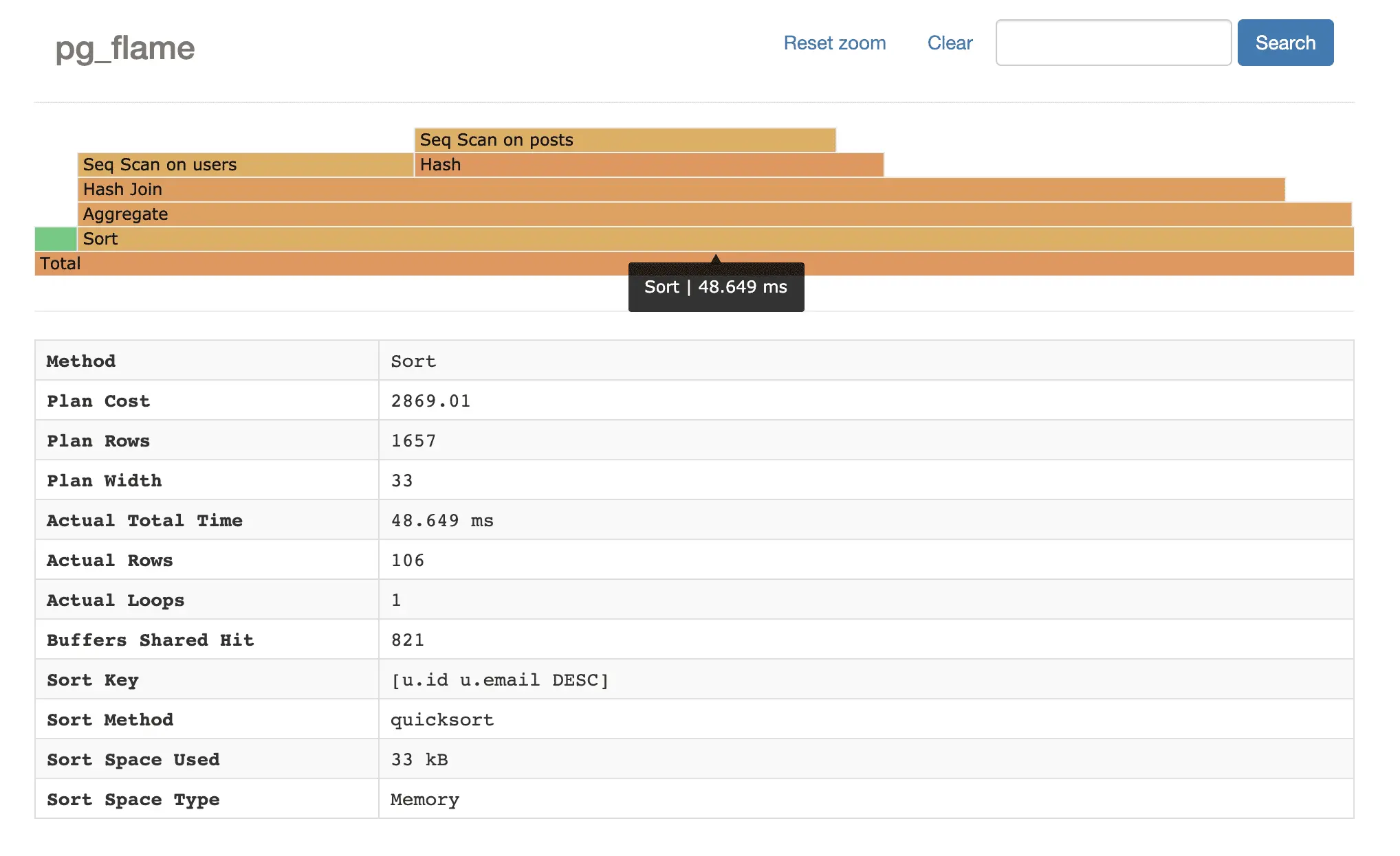 8、pg_flame:Postgres 数据库性能分析工具,把 EXPLAIN ANALYZE 结果通过火焰图展示