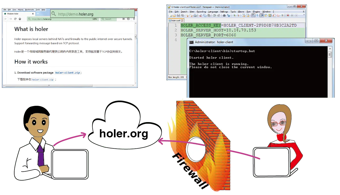 14、holer:一个将局域网中的应用映射到公网访问的端口映射软件,支持转发基于 TCP 协议的报文。内网穿透工具,包含 Web 后台管理系统。用到的技术如下: