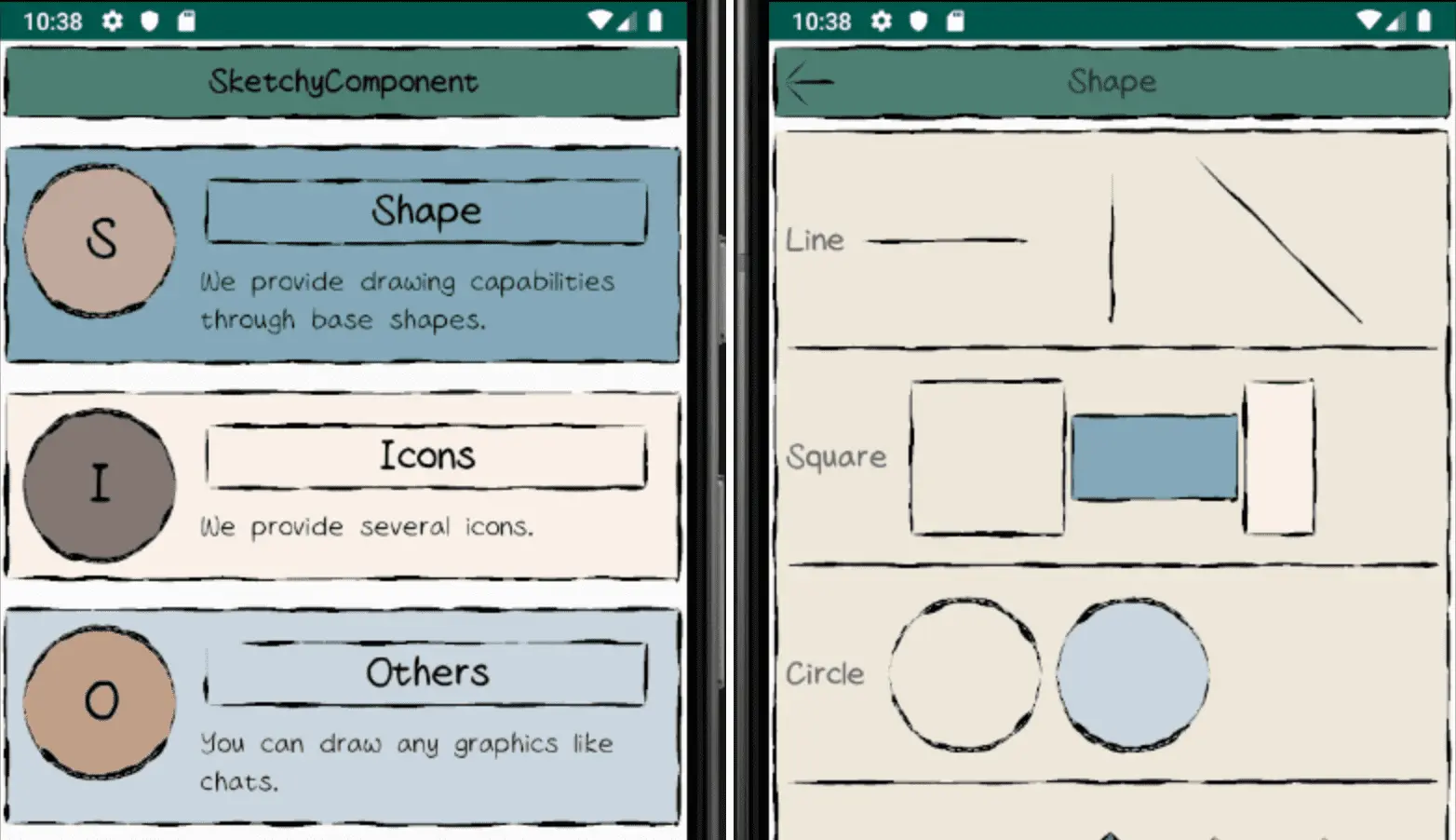 21、SketchyComponent:一款 Android 上的手绘风格组件库。该库提供了一些基础图形和 icon,以及便捷的自定义能力。之前介绍过手绘风格的图表库大家很喜欢,这回是 Android 组件库不知道对不对大家的胃口。示例代码: