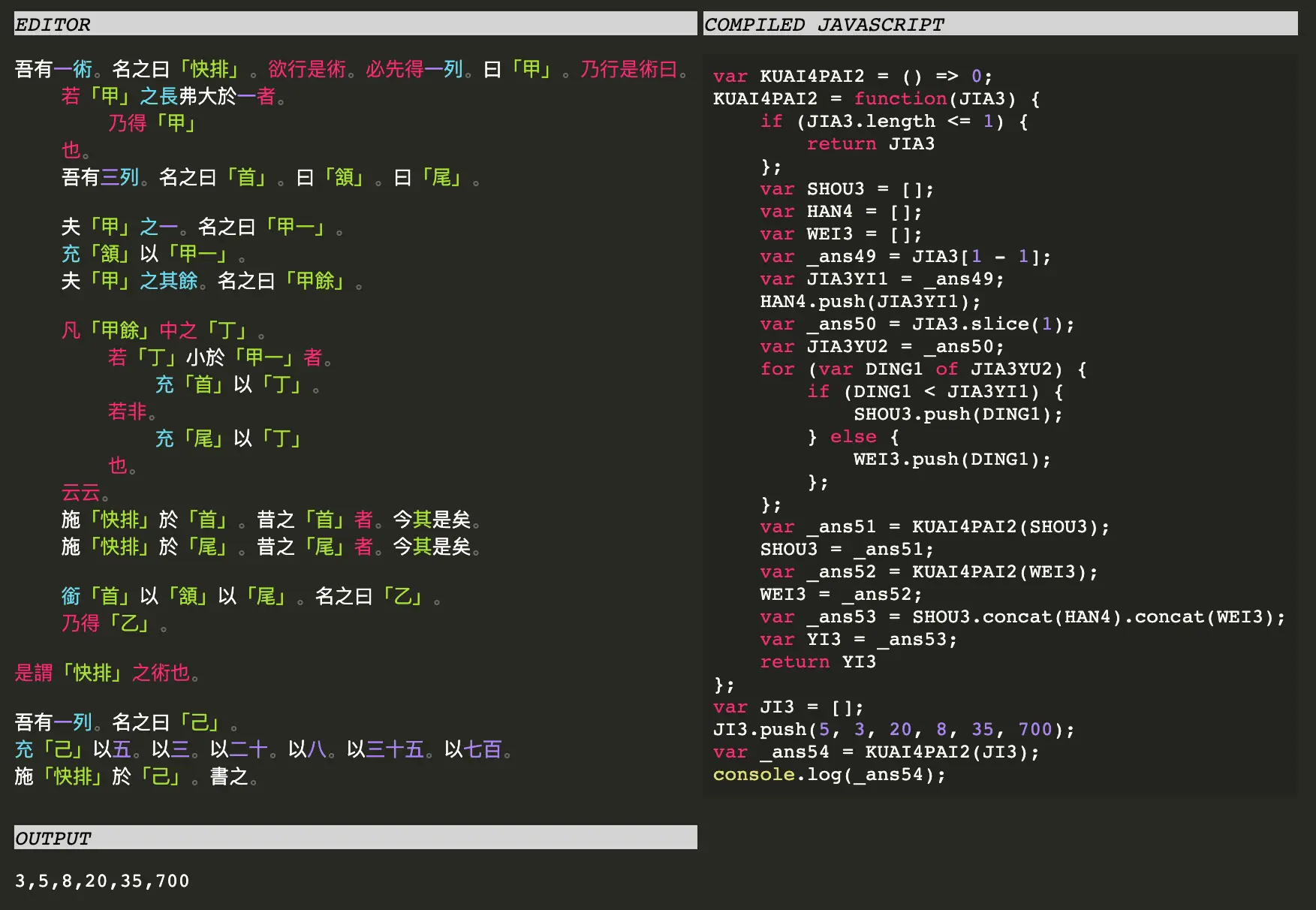 28、wenyan-lang:文言文编程语言。文言文语法,可以编译成 JavaScript、Python 或者 Ruby,你见过用文言文编写程序吗?快来试试吧。在线尝试