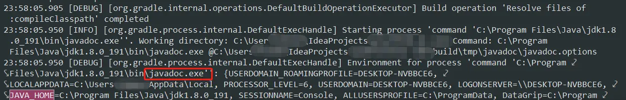 向上看触发这个日志输出的任务,能看出来是org.gradle.process.internal.DefaultExecHandle函数调用了jdk中的javadoc.exe程序,并且读取了系统的环境变量,并且其中包括CLASSPATH这个环境变量。