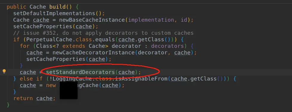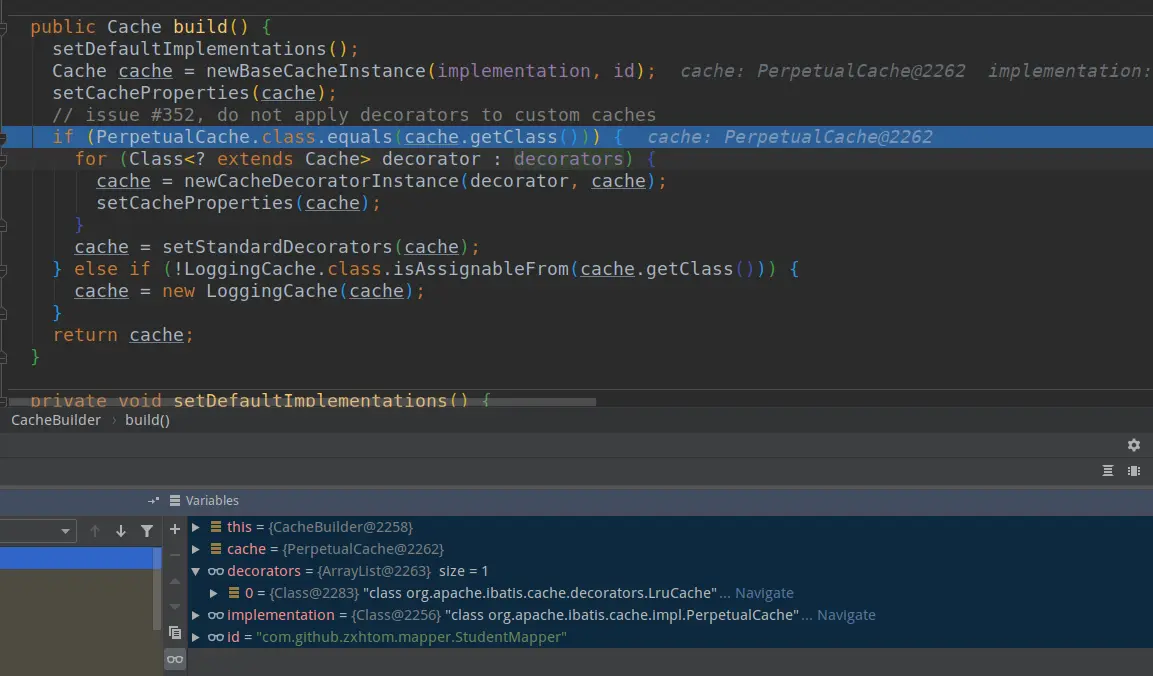 - 由上面代码我们得知mybatis会创建一个缓存对象。里面具体是通过一个build方法来创建的。我们在来看看build方法里是啥东西。