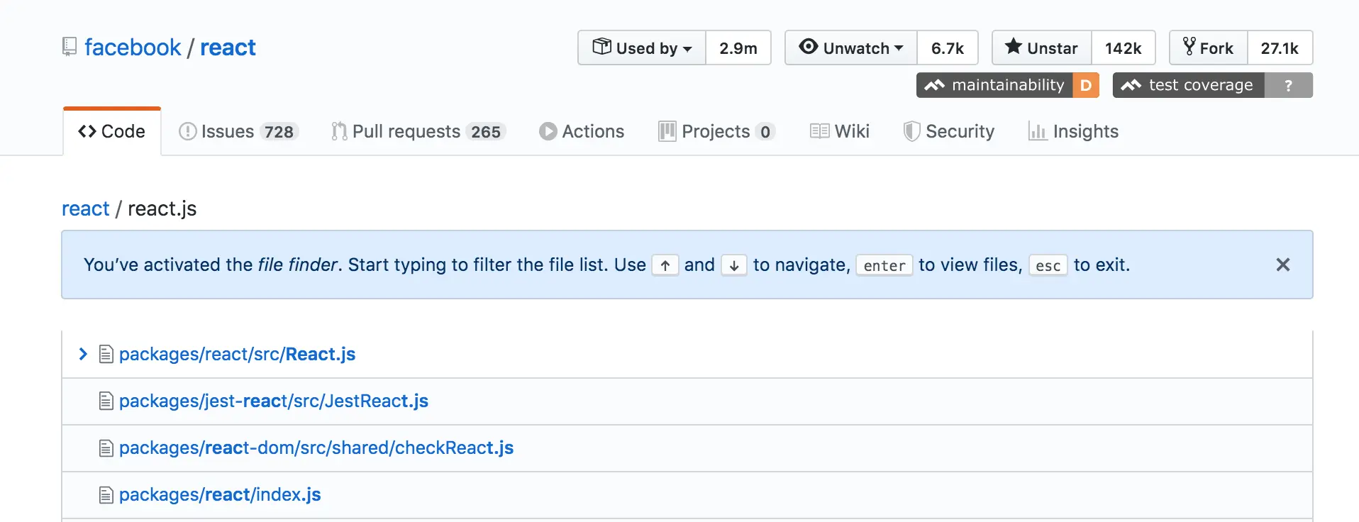 铺垫了这么久,我们终于找到了第一个要研究的对象 github.com/facebook/re… 一个小快捷键是在GitHub页面按字母T,可以打开文件搜索功能。
