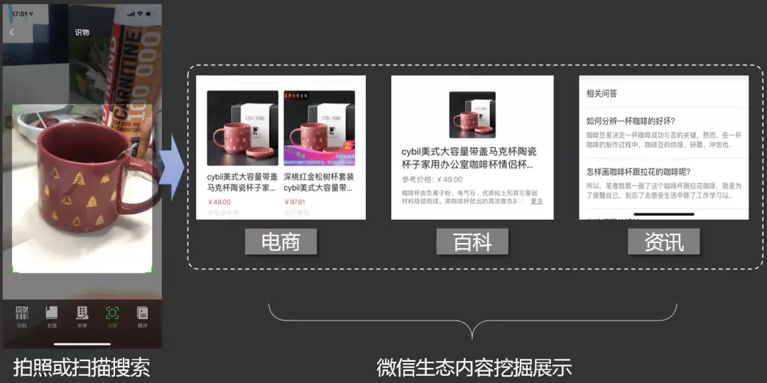 扫一扫识物的目的是开辟一个用户直达微信内部生态内容的一个新窗口,该窗口以用户扫图片的形式作为输入,以微信生态内容中的百科、资讯、电商作为展示页提供给用户。除了用户非常熟悉的扫操作,后续我们会进一步拓展长按识图操作,将扫一扫识物打造成用户更加触手可及的运用。扫一扫识物的落地场景主要涵盖 三大部分:
