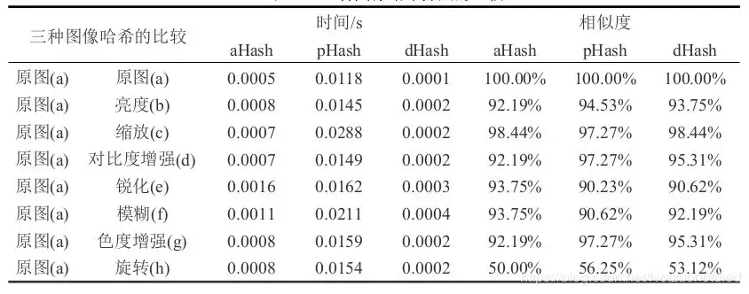 2)哈希去重,除完全重复图外,还能去除在原图上进行了些简单加工的图片,如改变原图的亮度、尺度、对比度、边沿锐化、模糊、色度以及旋转角度,这些图片保留意义也不大,因为在模型训练中采用数据增强策略可以覆盖到。常用的哈希去重主要有 aHash,dHash,pHash 等,详细理解可以参阅相关文章[1,2],我们重点对比各个去重算法的速度和鲁棒性,如下图 6 所示。