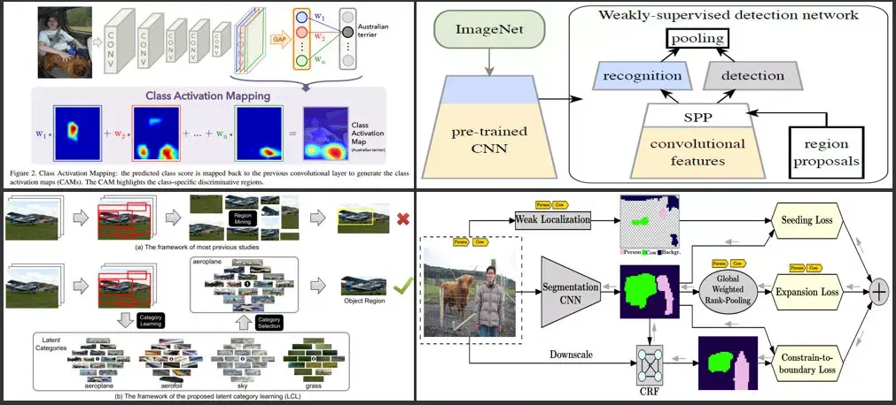 弱监督检测标注 该算法的核心思想是标注图片中所含物体的类别相比标注框+类别的时间成本要低很多,如何只利用全图类别信息来自动推断物体的位置信息,从而完成自动检测标注呢?学术界和工业界有大量的研究者对这一方向进行了研究和探索,主要思路都是挖掘图片中的局部显著性区域,用其来表征全图的类别语义信息,如图 9 列举了几篇代表性文章。图 9 左下角算法重点阐述下,它是业内第一篇用深度学习来做弱监督检测的文章,实验室师兄研发,我们还基于该算法参加过 ImageNet14 的竞赛,拿了一个小分支的冠军。尽管愿景很美好,弱监督检测算法有个严重的缺陷,就是很容易拟合到局部区域,比如从大量猫的图片中拟合到的位置是猫脸区域,而很难定位到完整的猫的位置,这对于我们同款商品检索来说是难于接受的,我们需要精确召回同一款商品(细粒度检索),所有信息量都非常重要,因而该算法基本被我们 pass 掉了。
