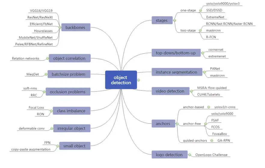物体检测是扫一扫识物的第一个环节,我们需要有效的定位用户拍摄图片中的商品位置,剔除掉背景对后续同款检索的干扰。学术界和工业界对物体检测展开了大量的研究,如下图 18 所示,研究者从不同角度对检测算法进行优化,如从速度考虑分为 one-stage 和 two-stage 检测;从 anchor 出发分为 anchor-based、anchor-free、guided anchors,近期 anchor 又开始崛起,在性能上匹配 two-stage,速度上匹配 one-stage;还有从类别不平衡出发,不同尺度物体检测等等出发。