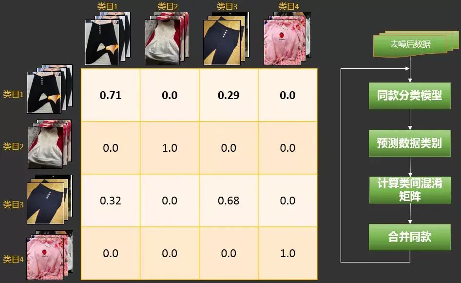 完成了图片去重和主体检测之后,大家一个自然的想法就是,能否直接用这批抠图后的商品图结合 SKU 货号进行检索模型的训练,答案是否定的,抠图之后的商品图还存在两大问题:1.同款噪声问题,即同一个 SKU 下面存在非同款的图片,这可能是由于用户上传错误图片、商家展示的是局部细节图、检测抠图错误等因素导致;2.同款合并问题,不同的 SKU 可能对应的是同一个款式商品,不加以合并,会导致分类类别数目急剧膨胀,而且模型难于收敛。因此,在训练检索模型之前,我们需要完成同款去噪和同款合并两个环节,我们提出了基于自动聚类的同款去噪算法和基于混淆分类矩阵的同款合并算法,如下图 11 所示。后续我们将分别对这个算法进行解析。