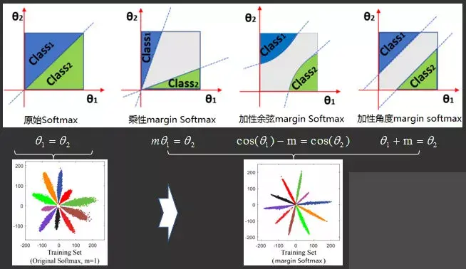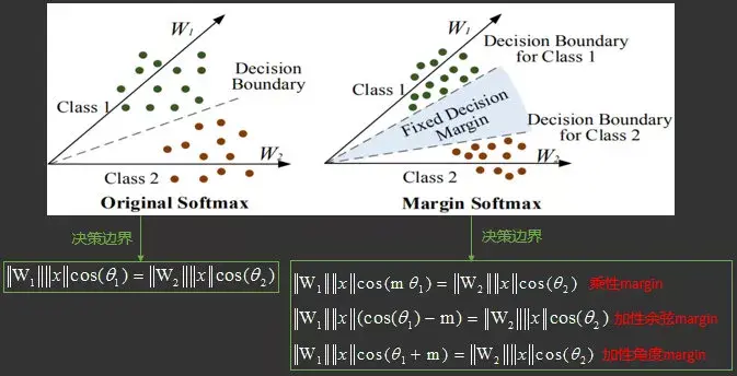 增加角度 Margin 的核心目的是让 softmax 分类的扇形分布更加有利于检索:即为同类更加聚集,不同类更加远离。常见的 3 种增加角度 margin 的策略入下图 25 所示:乘性 margin[10,11],加性余弦 margin[12],加性角度 margin[13]。