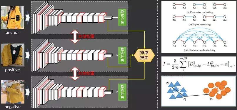 分类模型的学习目的是类别可区分,和检索任务还是有一定区别,引入排序损失的目的就是显示的去优化检索任务,即为欧式空间中同类样本的距离要小于不同类。一般排序损失和分类损失叠加使用效果要更好,我们设计的模型结构如下图 27 所示: