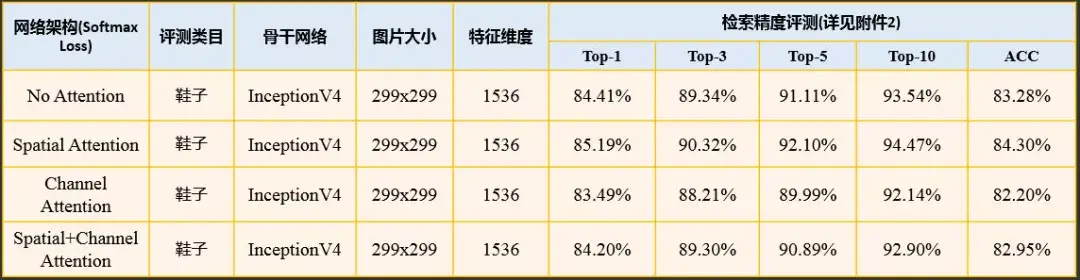 特征空间注意力,特征通道注意力,以及 2 种注意力相结合。通过实验对比可知,增加特征空间注意力后,模型检索性能提升,但是增加特征通道注意力,检索性能反而下降,如下图 34 所示。我们认为空间注意力有利于强化模型重视显著空间区域,而特征通道注意力可能造成了模型过拟合,性能反而有所下降。