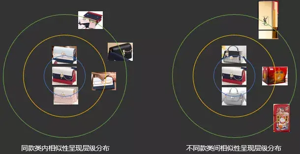 同样针对同款检索的两大难点和挑战,即类间混淆性和类内差异性,我们采用层级困难感知模型来充分重视这两大难题,如下图 35 所示的包包。尽管是同款,其相似程度可能有很大差异,如该款式包包由于拍摄视角、遮挡等造成的变化,对于非同款的负样本,也有非常相似的其他款式包包,和差异比较大的其他商品入酒类、口红等。