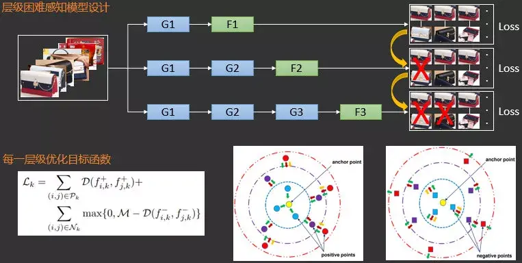层级困难感知模型模型[16]结构如下图 36 所示,其排序损失按层级分布,第一层级针对所有的正负样本进行排序学习,第二层负责较为困难的正负样本对,而第三层则负责更加困难的正负样本对,并且对于越困难的样本对,模型网络设计的越深。