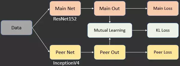 众所周知,一般竞赛中大家都会融合多个模型的结果来提升精度。但是在实际的项目落地,我们需要同时考虑部署模型的精度和速度,融合多个模型会占用更多计算资源,降低前向速度。那么怎么既然融合多个模型结构的优势,又不增加计算资源呢?这就是互学习模型的核心思想,如下图所示,互学习模型通过 KL 散度 loss 来吸收其他模型的结构优势,部署的时候只需要部署一个模型即可,不增加计算资源。