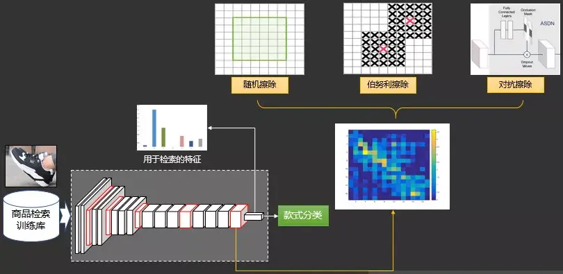 纹理的同时,也关注下物体的形状信息呢?我们采用局部显著性擦除技术来破坏原图的纹理,迫使模型来关注物体的形状。常见的局部显著性擦除有 3 种,如下图 41 所示,分别为随机擦除,伯努利擦除,对抗擦除。这里我们重点对比了前两者,对抗擦除后