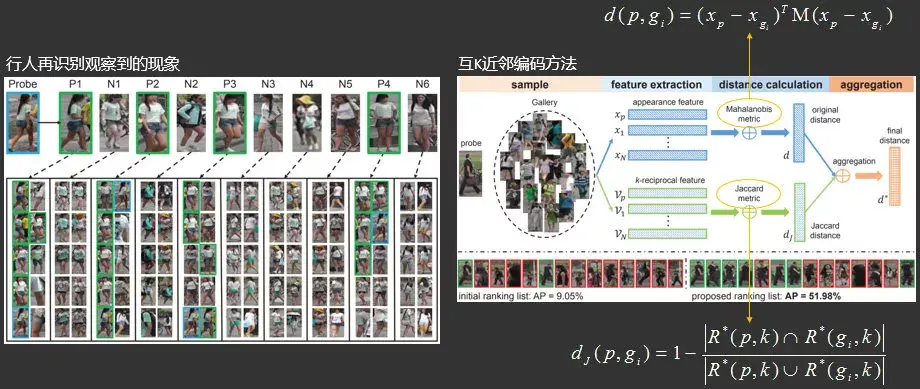 前面我们讲述的都是优化检索模型,这里我们讲述的是如何进一步优化检索模型的检索结果,即重排序。在重排序里面,我个人非常欣赏互 k 近邻算法[17],非常简单高效。互 k 学习算法最早被提出来用于行人再检索,如下图 43 所示,其核心发现是,对于 query 样本,其检索的 top-10 样本中,正样本(和 query 为同一人)换做查询样本时,其 k 近邻中有原始的 query 样本,而负样本(和 query 非同一个人),其 k 近邻中没有原始 query 样本,基于该发现,作者在马氏距离的基础上,增加了基于互 k 近邻的距离度量,如图中下方所示,基于该度量可以有效的对原排序进行重排序,将正样本挪前,将负样本挪后。