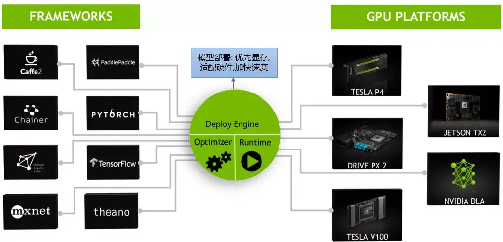 模型训练我们可以不在乎模型运行时间代价,但是在模型部署时候我们得要充分重视模型的资源占用情况,尽量提升模型的并发能力,如 GPU 部署时候优化显存,适配硬件,加快速度。这里我们重点介绍后台 GPU 部署使用的 tensorRT 和手机端部署使用的 ncnn。